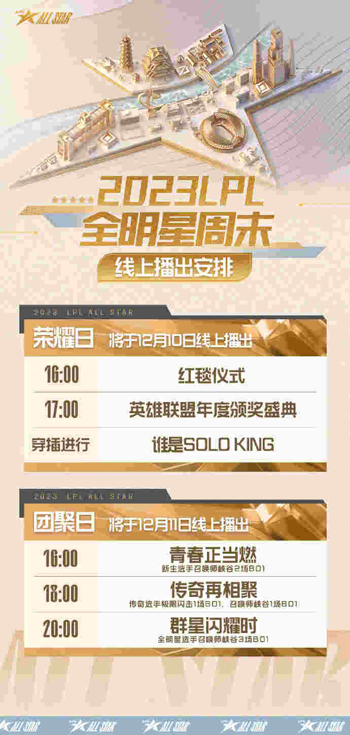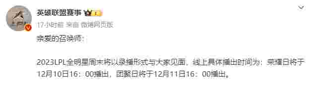 12月8日晚,英雄联盟官方发布公告,本将在今明两天举行并进行直播的2023LPL全明星周末将以录播形式放出