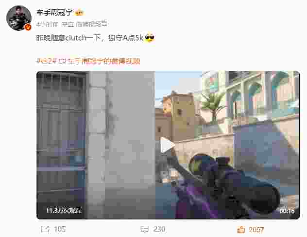 中国F1赛车手周冠宇在微博上分享了自己5E天梯的高光时刻,大狙AWP在Dust2豪取五杀ACE!