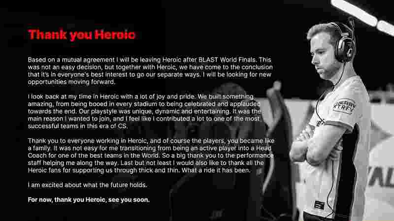今天Heroic战队宣布主教练Xizt将会在BLAST 全球总决赛之后卸任教练职务,并离开战队。今年1月份的时候Xizt同Heroic签署为期两年的续约合同。