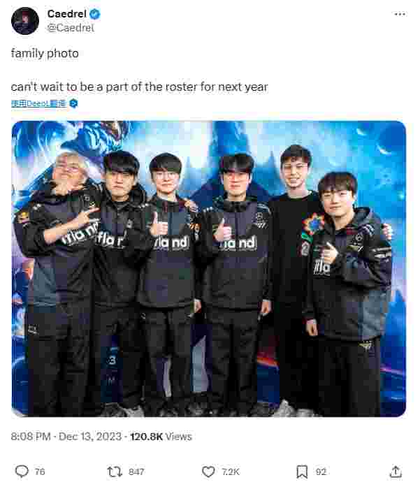 近日,欧刚Caedrel分享和S13冠军俱乐部T1全员的合影,并配文:“全家福,迫不及待想成为明年名单的一部分了!”