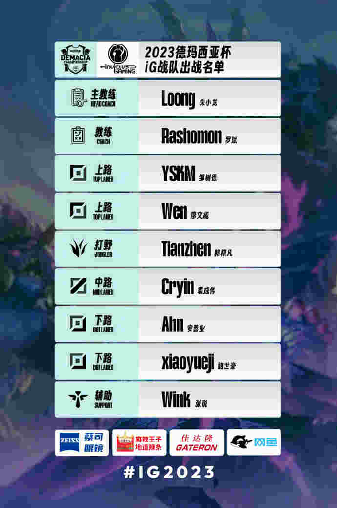 12月15日下午,IG俱乐部官方微博宣布2023德玛西亚杯首发名单: