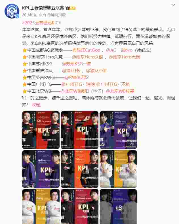 12月15日,KPL在官博晒出KPL赛区出征KIC推荐选手图,原文如下: