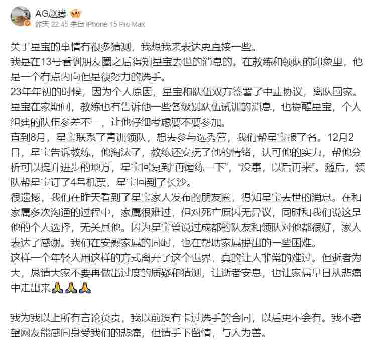 很遗憾,我们在昨天看到了星宝家人发布的朋友圈,得知星宝去世的消息。在和家属多次沟通的过程中,家属很难过,但对死亡原因无异议,同时和我们说这是他的个人选择,无关其他。因为星宝曾说过成都的队友和领队对他都很好,家人表达了感谢。我们在安慰家属的同时,也在帮助家属提出的一些困难。