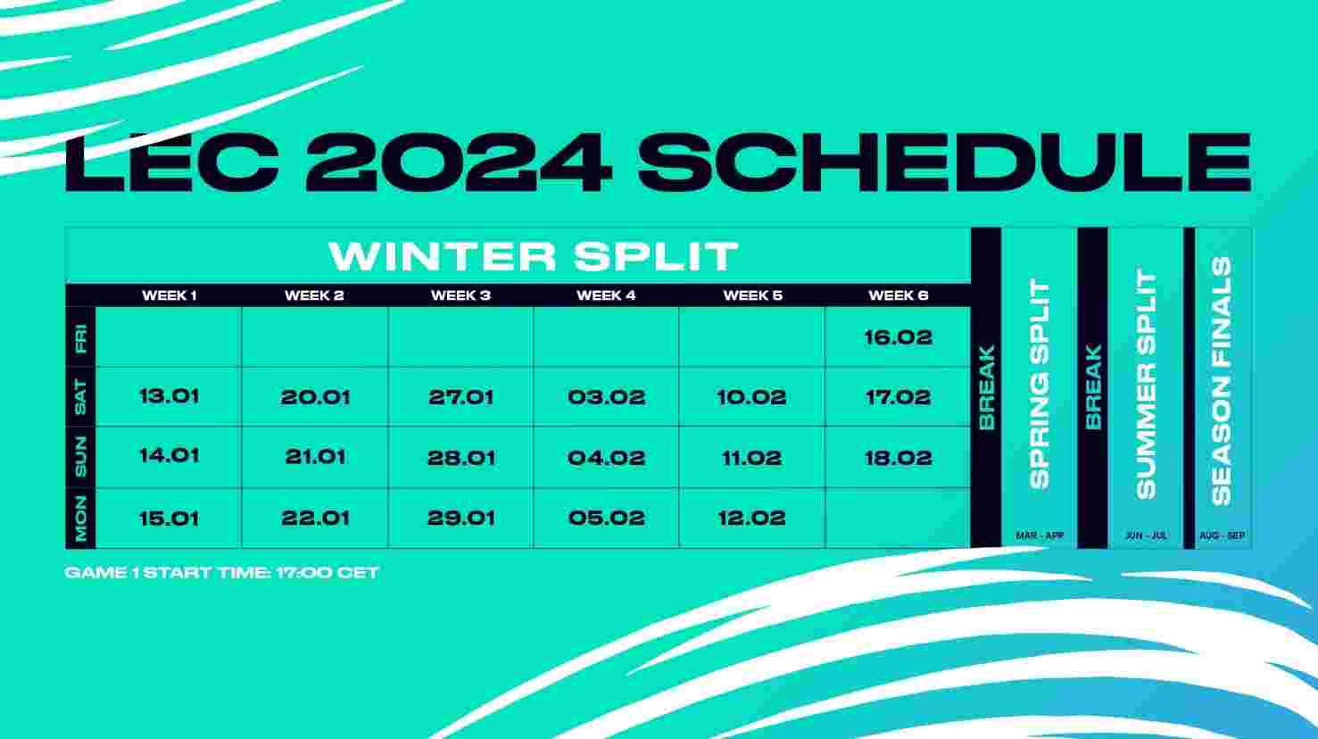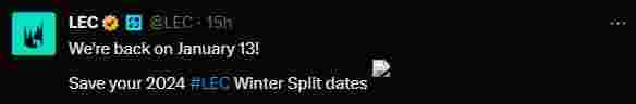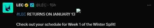 12月16日下午,LEC赛区官方推特发布了2024冬季赛赛程和第一周的对阵(LEC赛区每年分为三个赛段,比其他赛区多一个冬季赛):