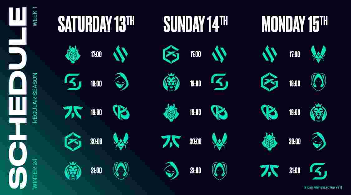 LEC2024冬季赛将在2024年1月13日正式开打,每周共计进行三天的比赛,从下午17:00开始第一场,赛程总共持续6周共18天。