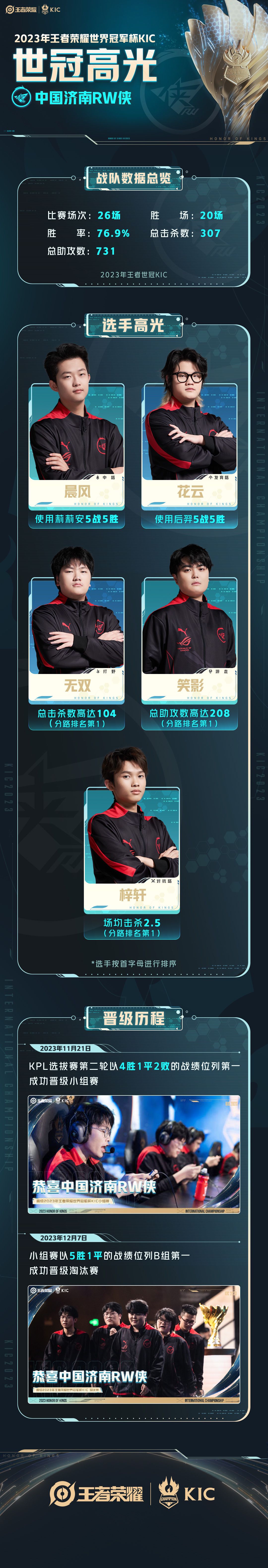 中国济南RW侠共比赛26场,胜场20场,胜率76.9%;总击杀数307,总助攻数731;