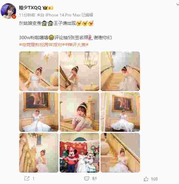 12月17日,LPL解说瞳夕微博达到300万粉丝,随后在微博分享了一组照片,内容如下: