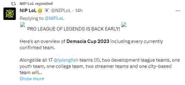 12月18日晚,NIP英雄联盟分部官方推特透露了2023年德玛西亚杯赛程和分组: