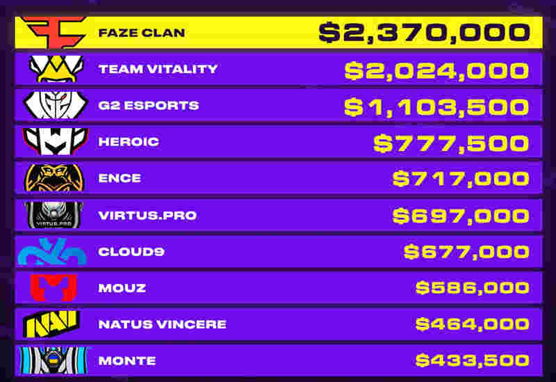 FaZe获得了237万奖金,领跑所有职业战队。