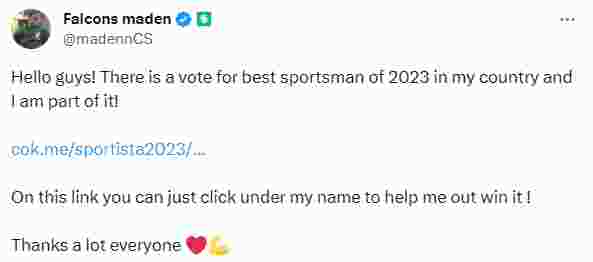 ”大家好!在我的国家,有 2023 年最佳运动员的投票,我是其中的一员!在此链接上,您只需单击我的名字即可帮助我赢得它!