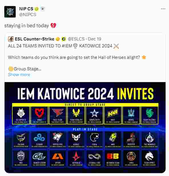 昨日,赛事主办方公布了IEM卡托维兹2024的直邀战队名单,但可惜的是我们并未看到
