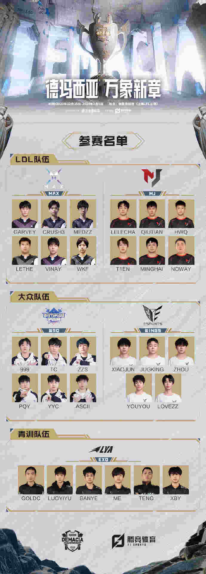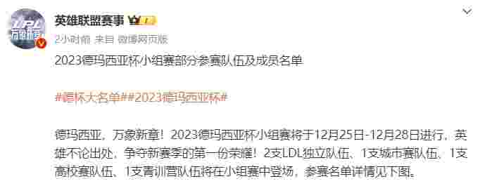 12月21日中午,英雄联盟赛事官方微博发布了2023德玛西亚杯小组赛部分参赛队伍及成员名单,其中包含5支非LPL联赛的参赛队伍: