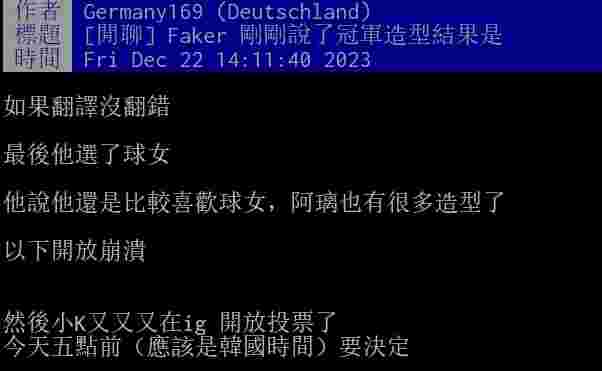 12月22日,Faker在此前个人直播中透露冠军皮肤选择了发条而没有选择阿狸,中国台湾PTT论坛的网友对此展开了讨论: