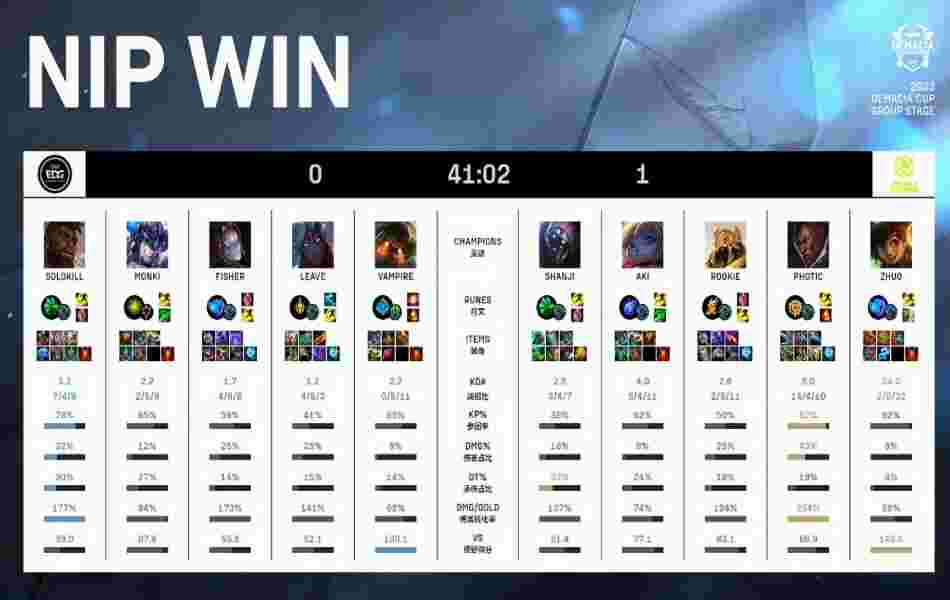 第39分钟,NIP在中路抓到机会打出EDG多人顺势拿下大龙后转进上路,沙皇在高地完美回推大到三人,配合队友成功打出1换5后一波结束了比赛。