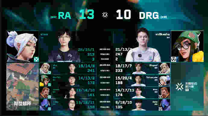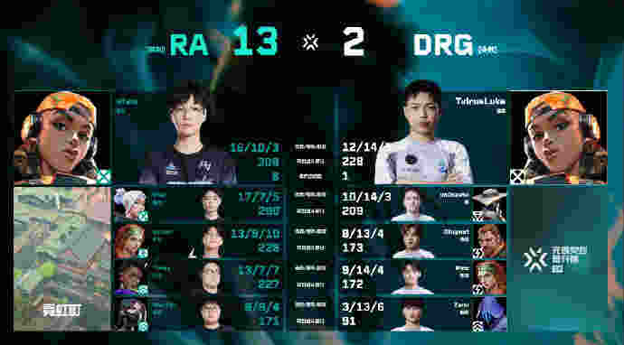 下半场开始,DRG赢得了手枪局,并在经济上占据优势,持续追分,比分来到了10:6。RA选择叫出暂停进行战术调整。暂停之后,DRG继续追分的节奏,紧咬比分,Dingwei更是斩获四连杀,大幅提升士气。第二十二回合,stew冥驹前压,帮助RA获得人数优势,并率先赢得赛点。最终,在stew的四连杀下,RA结束了本场比赛。