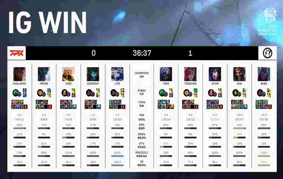 第11分钟,双方爆发小龙团战,FPX率先拿下小龙,贾克斯跳斩反击风暴进场,配合德莱文爆炸输出,IG轻松打出一波1换4赢下团战。
