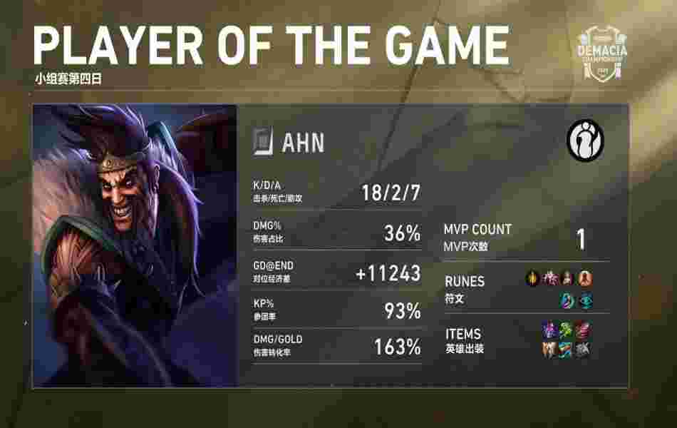 第26分钟,双方在中路爆发团战,狐狸R闪E控到沙皇配合队友完成秒杀,德莱文无压力输出轻松砍下四杀,IG打出一波2换4后顺势拿下大龙。