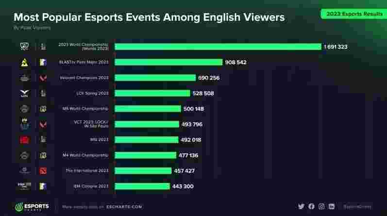 12月29日,国外数据统计网站Esports Charts统计了2023年各电竞赛事英语频道观众的观赛数据,观众峰值前十的电竞赛事排名如下: