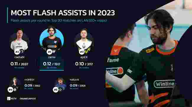 日前HLTV公布了今年的闪光助攻大师。从数据看,Jame每回合的闪光助攻为0.12,排名第二的是cadiaN,排名第三的是apEX。