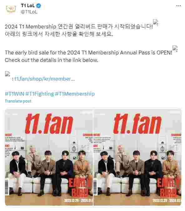 12月29日下午,T1英雄联盟分部官方推特发布消息,2024年T1粉丝俱乐部年度通行证开放早鸟促销,并分享了五名成员新的照片: