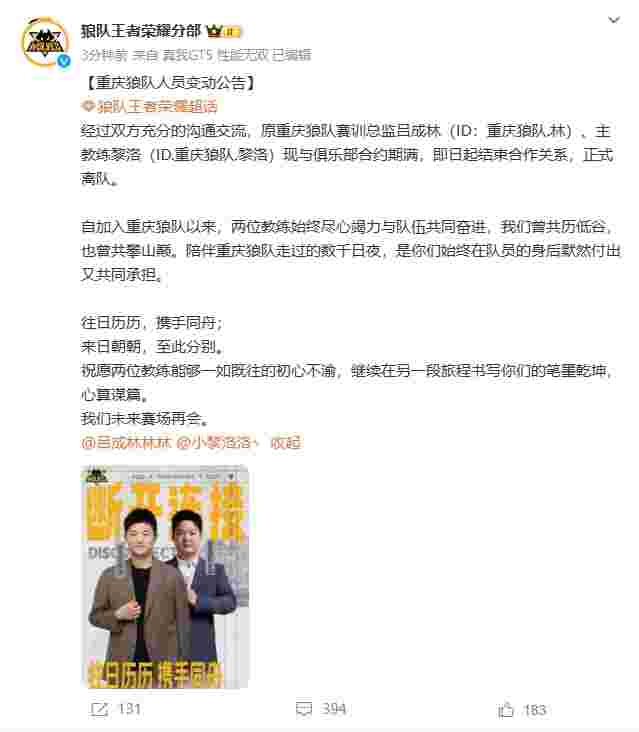 12月29日,狼队王者荣耀分部官方消息,经过双方充分的沟通交流,原重庆狼队赛训总监吕成林(ID:重庆狼队.林)、主教练黎洛(ID.重庆狼队.黎洛)现与俱乐部合约期满,即日起结束合作关系,正式离队。