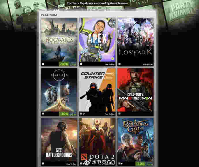 Steam刚刚公布了2023年玩家评选的白金级游戏榜单,九个游戏入选。分别是:霍格沃兹之遗、APEX、命运方舟、星空、CS新版本、使命召唤、PUBG、DOTA2和博德之门。