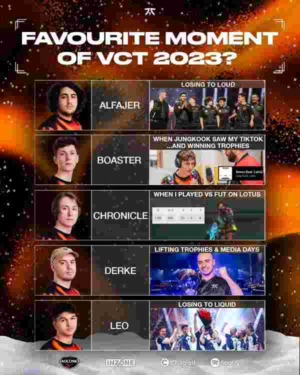 随着2023年正式宣告结束,Fnatic全员也分享了他们在过去成绩斐然的一年中最喜爱的时刻: