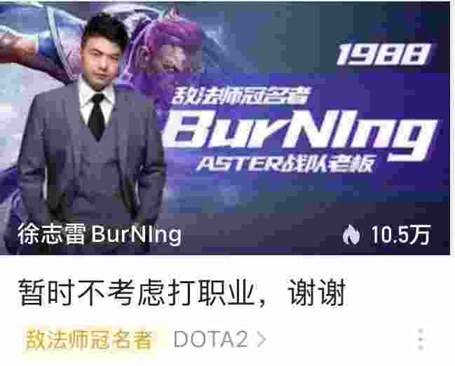 最近很多退役了的职业选手重出江湖,引起不小的轰动。国外很多网友在Reddit上讨论,在最希望看到复出的中国DOTA2职业选手评选中,Burning排名第一。B神是DOTA2三大C之一,也是DOTA1的敌法师冠名使用者,是上古巨神般的存在。B神的职业生涯贯穿DOTA1和DOTA2,在DK取得了无数荣耀,最终在iG退役告别了职业舞台。