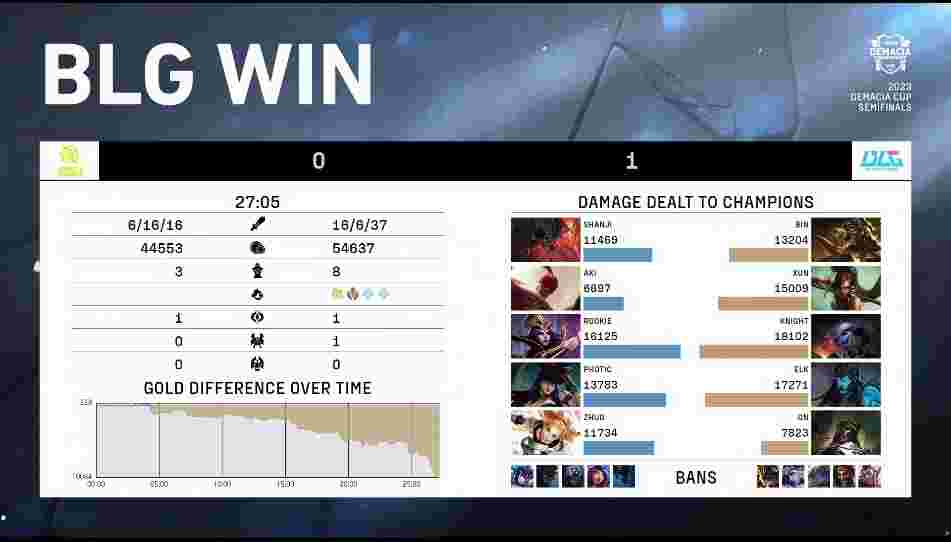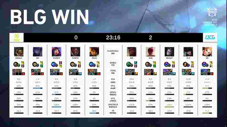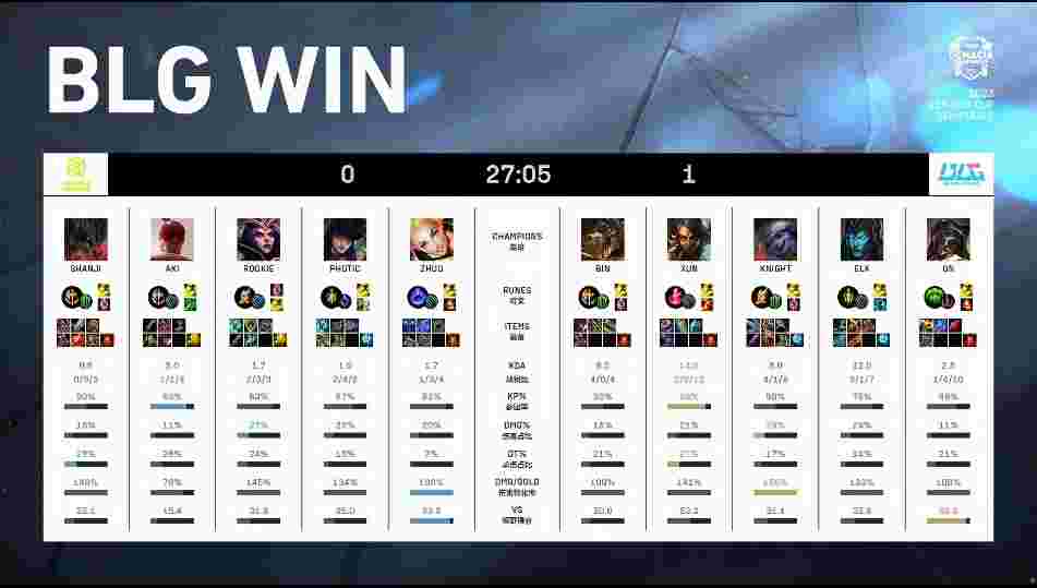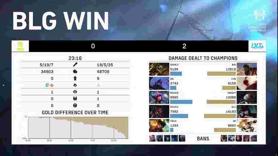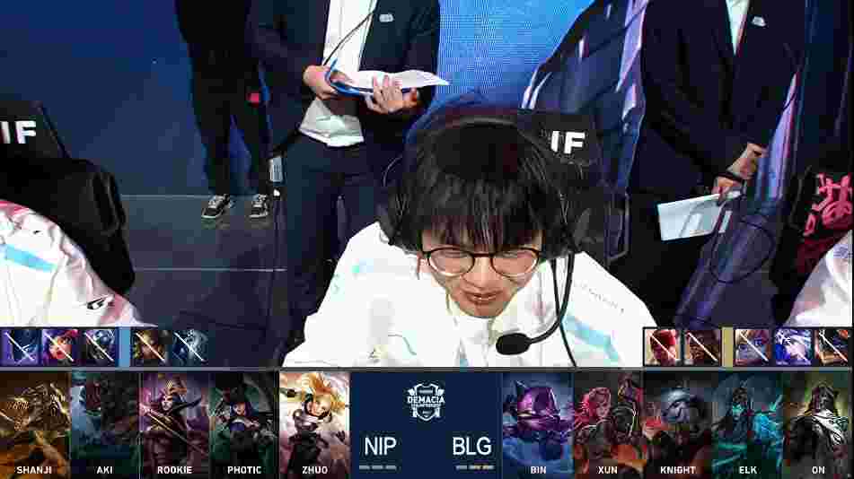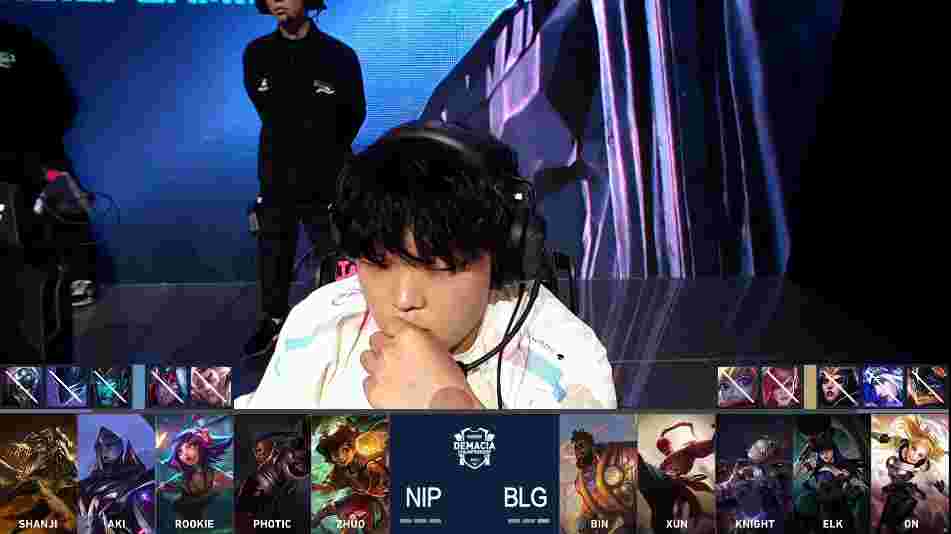 第25分钟,BLG开打大龙,NIP选择中上gank下路带线的凯南,大树试图抢龙失败,凯南也在下路完成了一打二双杀,剩余的NIP下路两人也毫无办法被追击而死,BLG顺势中下一波结束了比赛。