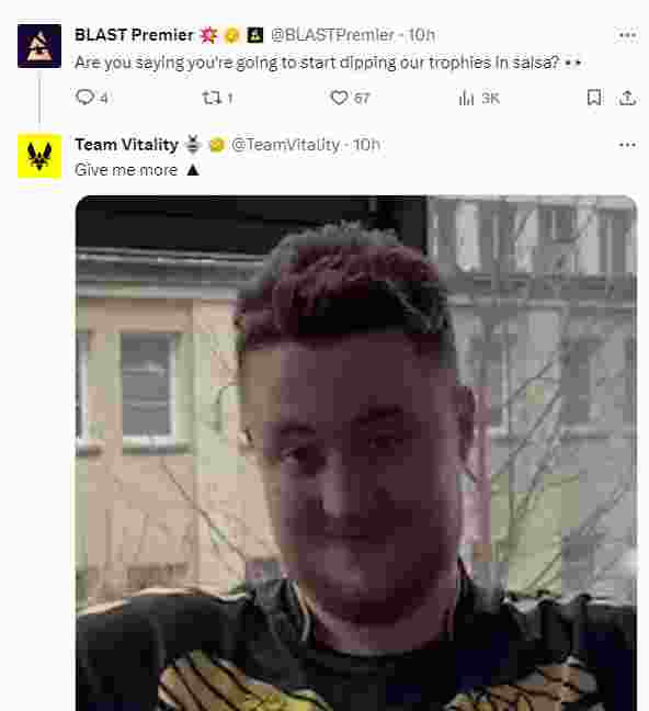 在下方赛事主办方BLAST跟帖评论道:“你的意思是想拿我们的奖杯蘸酱?”