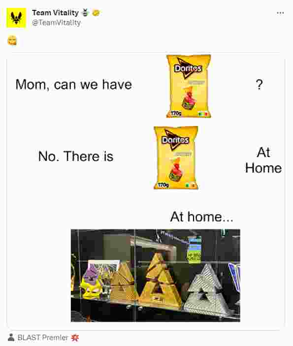 Vitality在官推发布一张图片,凡尔赛地晒出了俱乐部陈列柜里的诸多BLAST奖杯,其中包括一座含金量满满的Major冠军奖杯。
