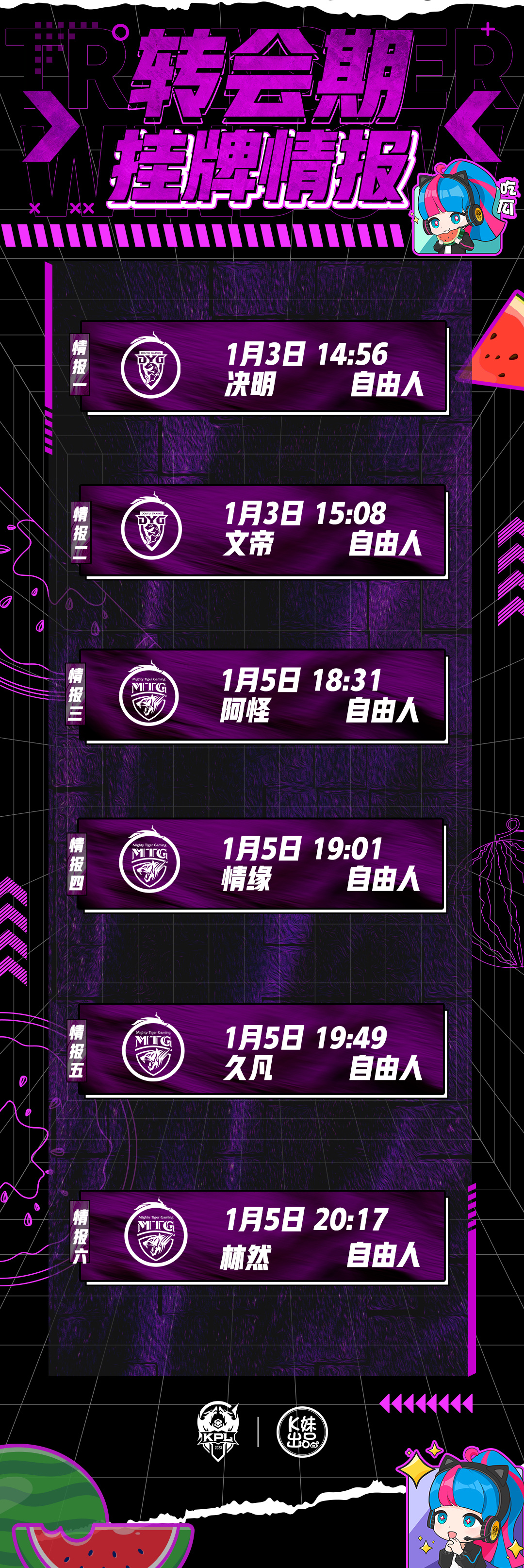 2024KPL春季转会期今日是转会期的第一天,K妹惊喜地发现今年的转会期相较于往常安静了不少,很多的俱乐部都不约而同按捺住了自己的想法,迟迟没有队伍公布挂牌情况,给这次转会期又蒙上了一层神秘的面纱。截止目前,深圳DYG王者荣耀分部 官宣深圳DYG.汪锦文(文帝)、深圳DYG.杨家豪(决明)以自由人身份离队,郑州MTG猛虎电竞俱乐部 官宣郑州MTG.贾文正(阿怪)、郑州MTG.吕航凡(情缘)、郑州MTG.沈一凡(久凡)和郑州MTG.许林锋(林然)以自由人身份离队。