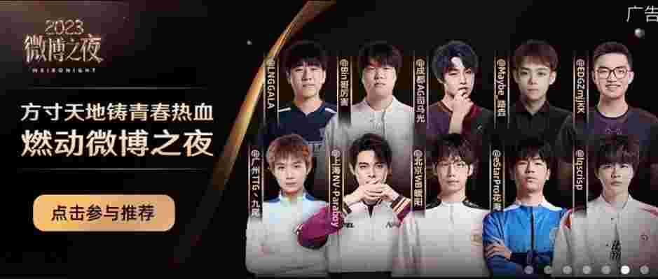 1月6日,2023年微博之夜将在1月13日开始,根据本届微博之夜的广告显示,受邀的电竞选手阵容有:Bin、GALA、Maybe、ZmjjKK、花海等十位不同项目的电竞选手受邀出席。