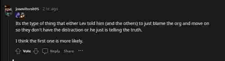 底下马上就有聪明老哥回复:感觉LEV最近的一些官方言论和队员的表示是想让整个俱乐部背下这个大锅,为了成绩不顾一切了。