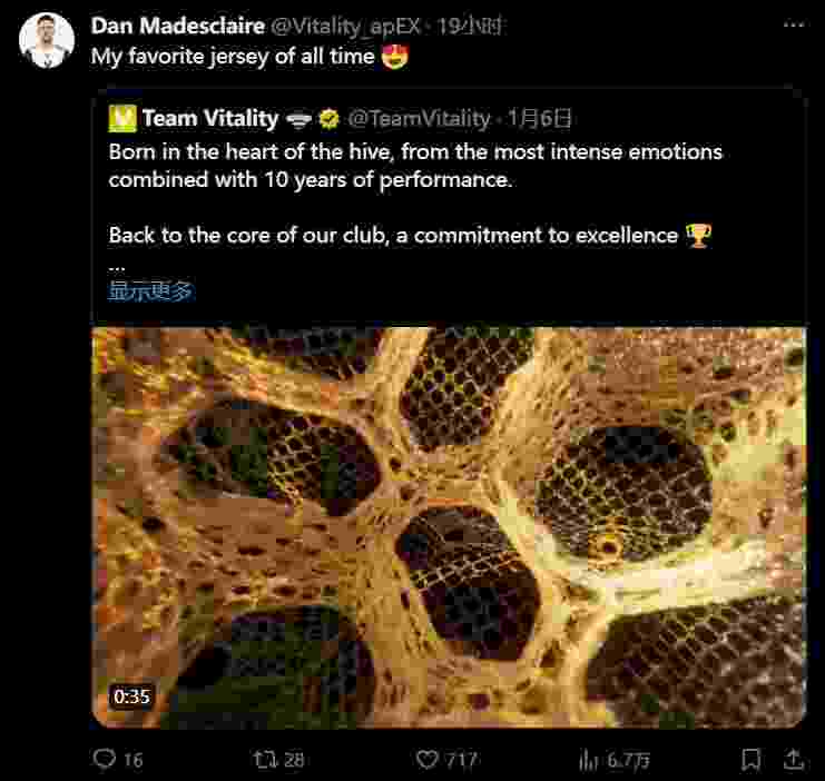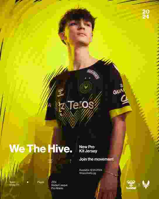 Vitality俱乐部发布了2024全新队服,这款队服会在1月12日上市。队服的设计整体还是采用经典的黄黑配色,不过Vitality的 LOGO周边先是被六边形环绕以致敬蜂巢,然后则是层层圆圈包裹。在LOGO上方还有两颗星的设计,应该是和俱乐部获得的两场重大比赛胜利有关,和