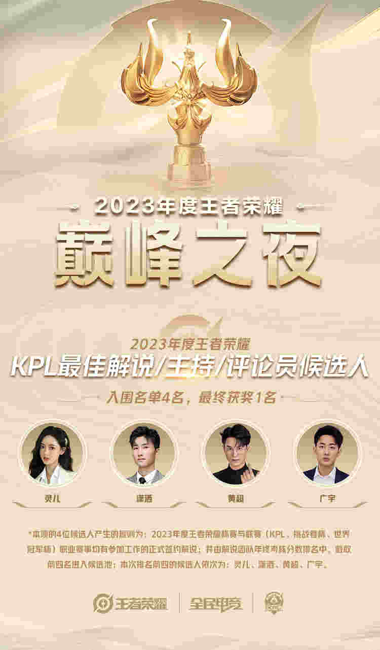本项的4位候选人产生的规则为: 2023年度王者荣耀杯赛与联赛 (KPL、挑战者杯、世界冠军杯)职业赛事均有参加工作的正式签约解说;并由解说团队年终考核分数排名中,截取前四名进入候选池,本次排名前四的候选人依次为: 灵儿、潇洒、黄超、广宇。