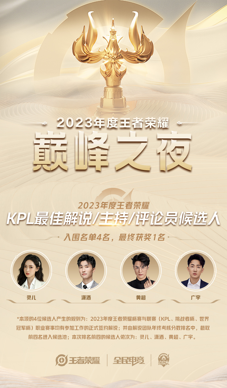 本项的4位候选人产生的规则为: 2023年度王者荣耀杯赛与联赛 (KPL、挑战者杯、世界冠军杯)职业赛事均有参加工作的正式签约解说;并由解说团队年终考核分数排名中,截取前四名进入候选池,本次排名前四的候选人依次为: 灵儿、潇洒、黄超、广宇。】