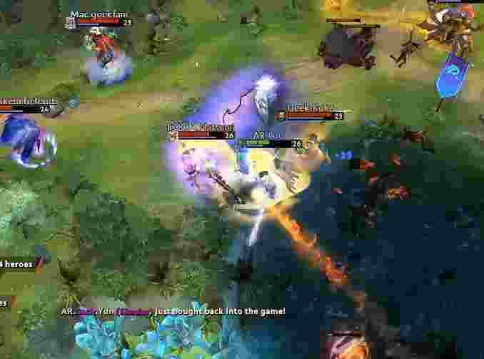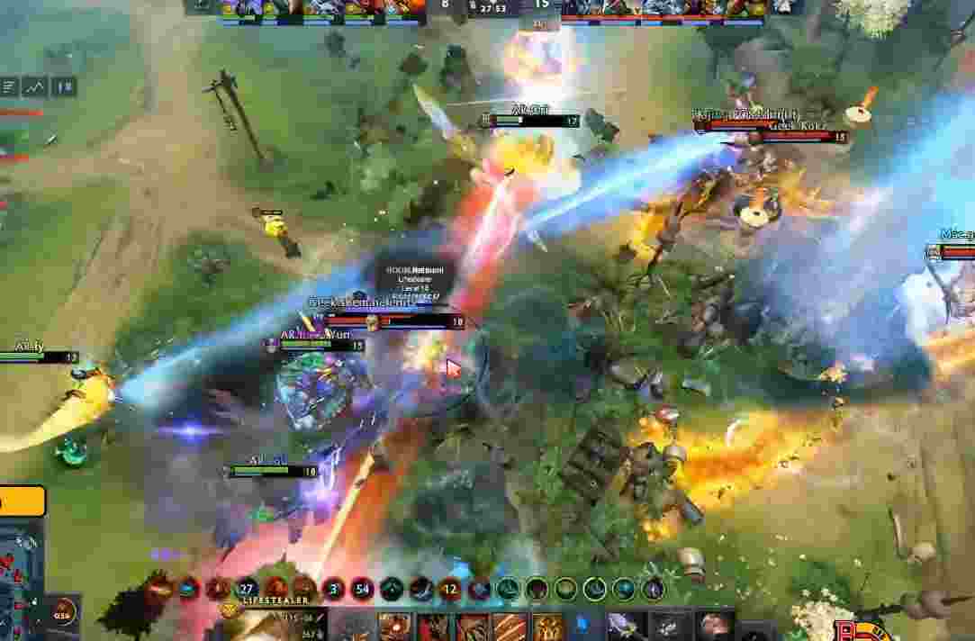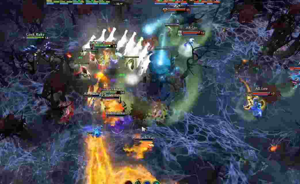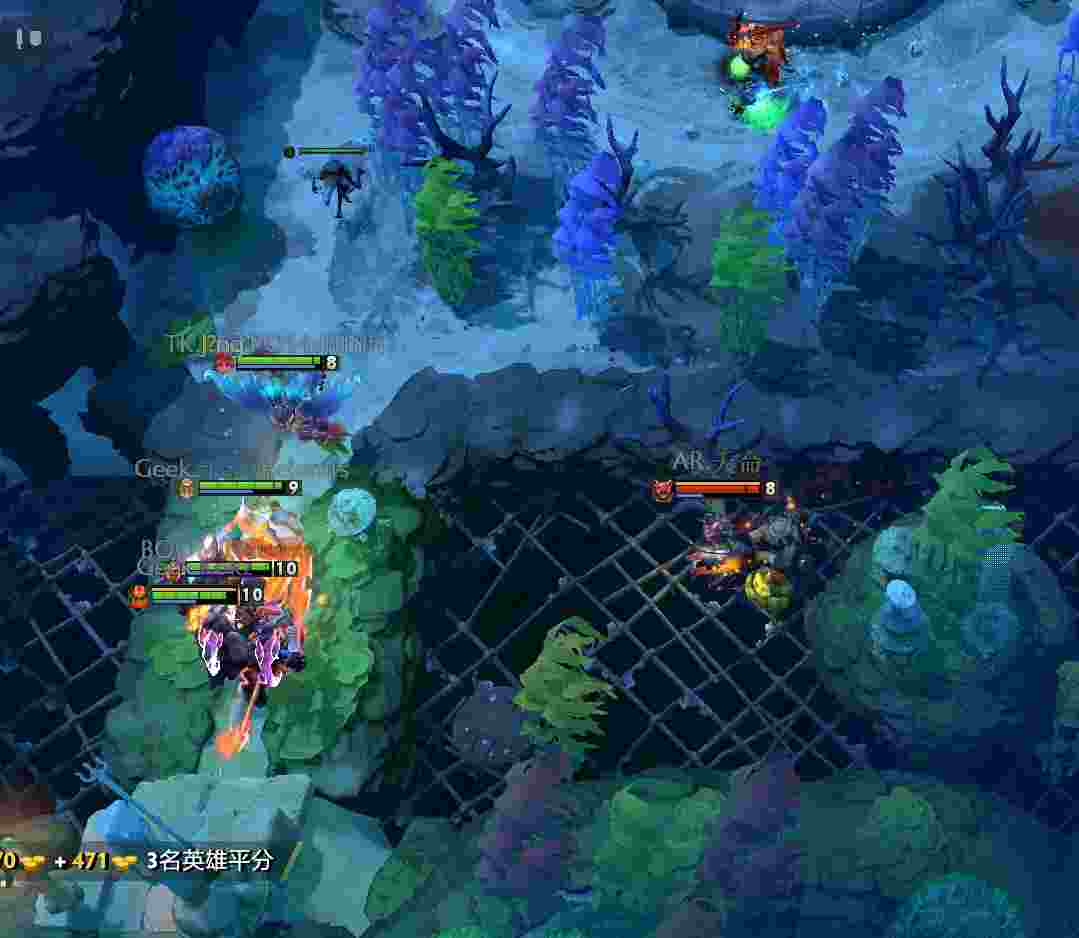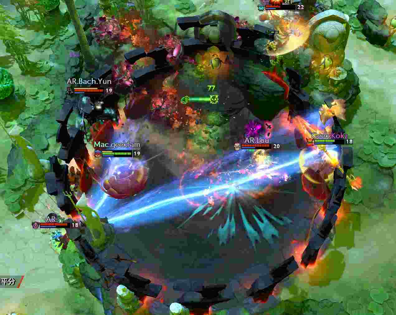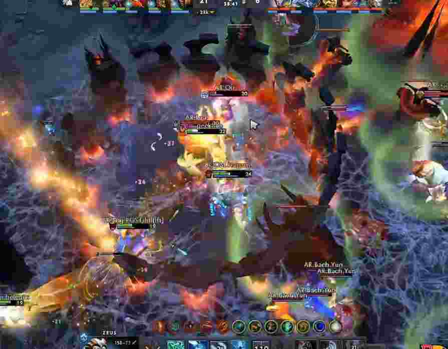 AR撤退后20分钟轻松打掉肉山,巨魔带盾一路杀到上路高地。Geek尝试开雾绕后,但用尽所i有技能也仅杀掉老陈。
