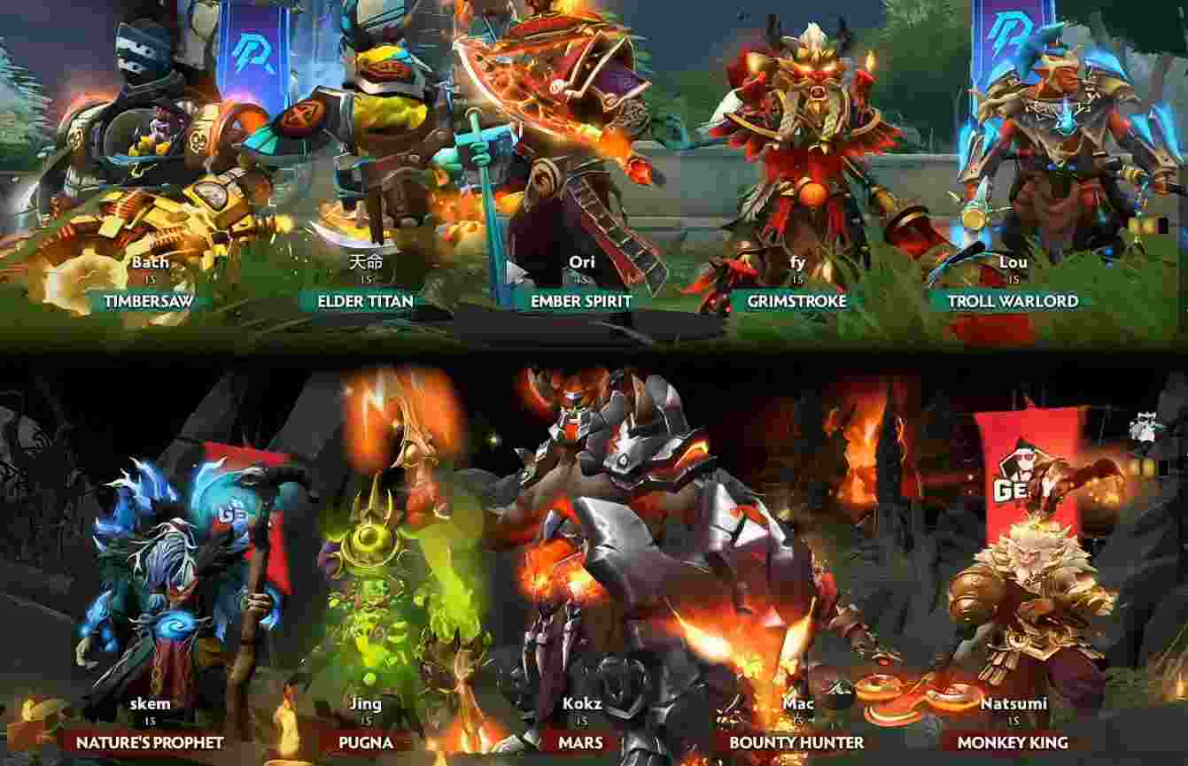分路情况中路火猫打赏金,上路巨魔+大牛对玛尔斯+骨法,下路伐木机+墨客对大圣+先知。
