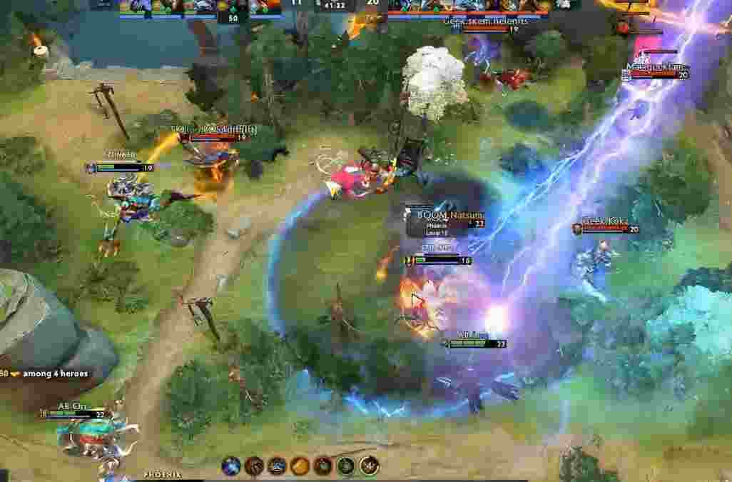 55分钟AR集合推中,Geek众人开雾绕后,宙斯打出AR众人视野后蝙蝠再次失误带狗走上去被猛犸大到,船长什么事也没干在原地被晕到死,Geek两大哥全部白给,但中路兵线被宙斯断掉,AR拆掉中路高地塔后撤退。