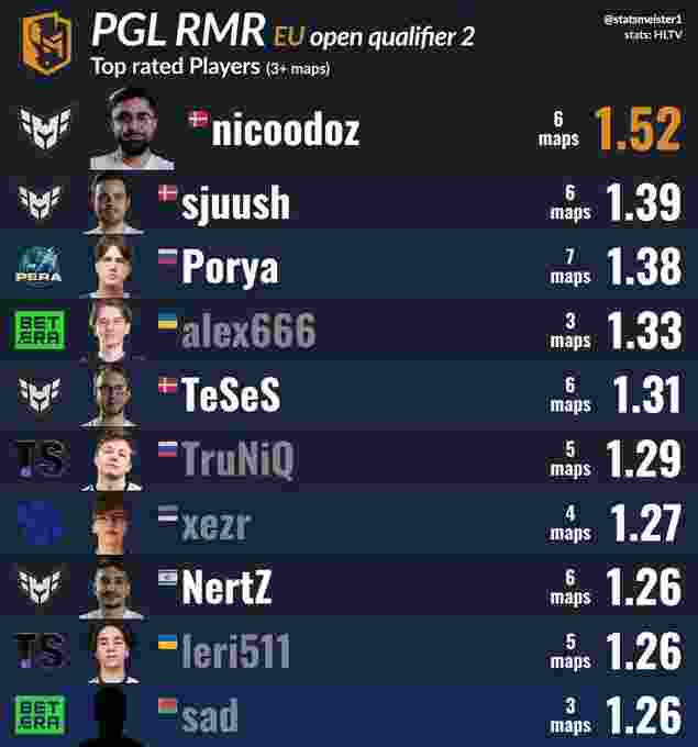 PERA四支队伍已经收获了封闭预选赛的参赛资格。CSer也统计了欧洲RMR第二场公开预选赛的rating。