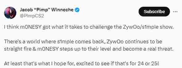 在当今世界,s1mple会回归,ZywOo会继续火力全开,而m0NESY则会提升到他们的水准,成为真正的威胁。