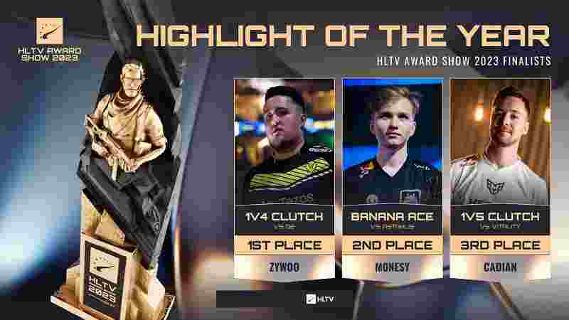 HLTV在2023颁奖典礼上公布了年度最佳高光时刻,ZywOo在BLAST.TV 巴黎Major上的1V4残局荣获该荣誉,m0NESY的AWP+沙鹰ACE位列第二,cadiaN的BLAST残局1V5当选第三。
