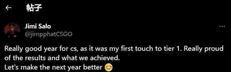 ”今年对CS来说真的是很棒的一年,同时也是我首次接触T1。真心为我们取得的成绩而骄傲,让我们一起让明年更好吧。“