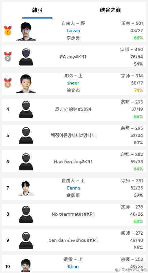 近日,新赛季开始以后,许多选手和主播们在韩服开始了冲分之旅,而有网友发现Tarzan在失业以后成为了第一个打上韩服最强王者段位的人: