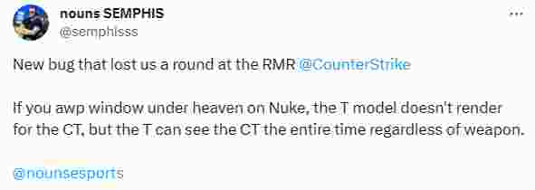 在Nuke衣帽间开镜架外场的缝隙时,T方的模型不会显示。而T方不管用什么武器,都可以看到CT方。”