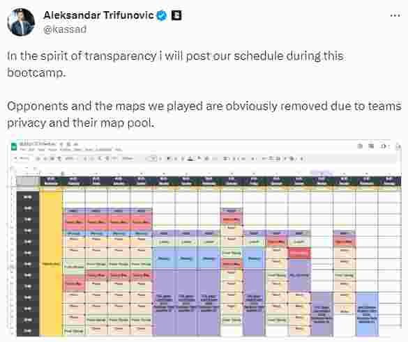 Aleksandar Trifunović | kassad在X上公开战队训练日程,战队在没有比赛的情况下,大部分会在10:00集合,然后开会,之后安排训练。