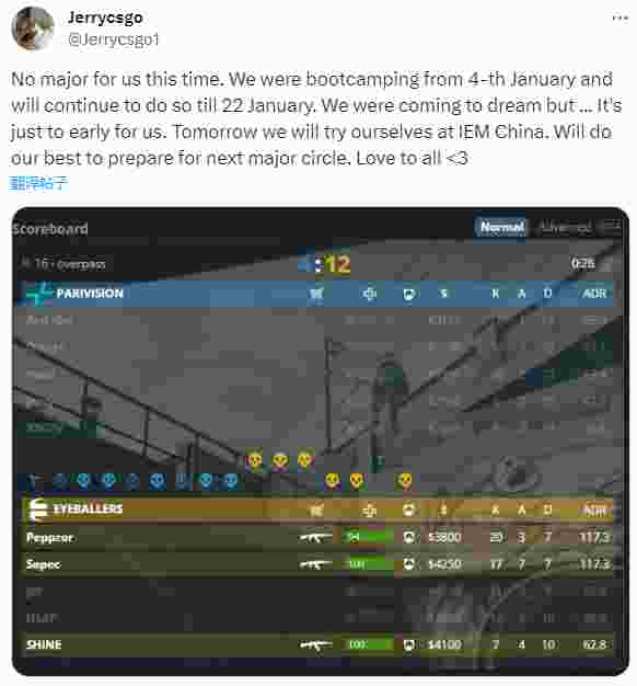 赛后Jerry也是在X上发推表示遗憾:“很可惜这次我们没能晋级Major,我们从1月4号开始集训,我们会继续训练到22号的,虽然没有Major了,但是我们会在接下来的IEM成都预选赛上努力。”