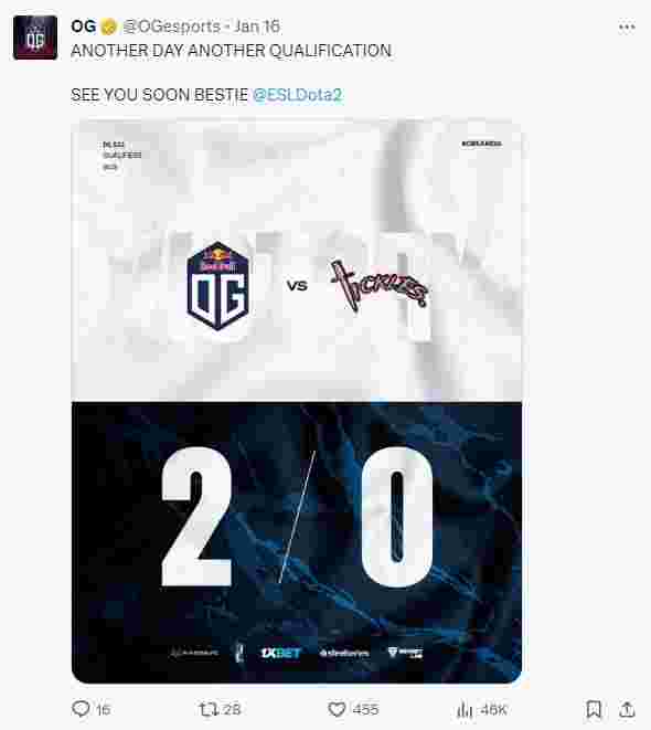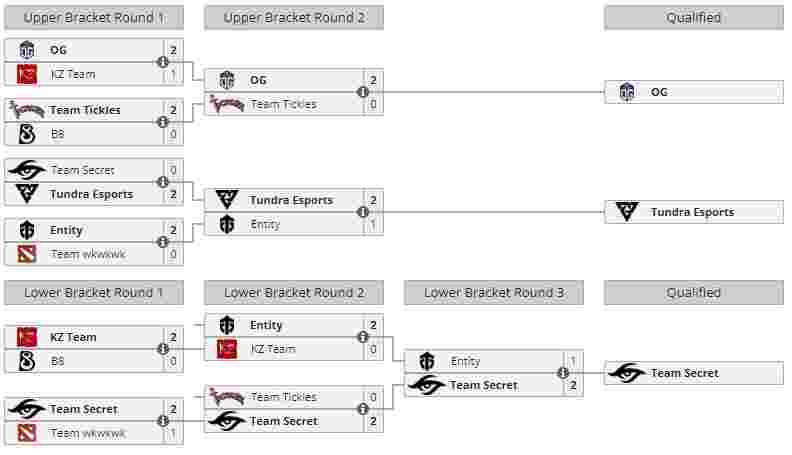 OG和Tundra的预选赛之旅比较轻松,OG在上半区战胜了KZ Team和Team Tickles轻松晋级,Tundra在下半区横扫Team Secret后在Entity身上稍微遇到了一些难题,在经过64分钟的大战先丢一局后Tundra连续两场抢下VS和滚滚,让一追二战胜了Entity。