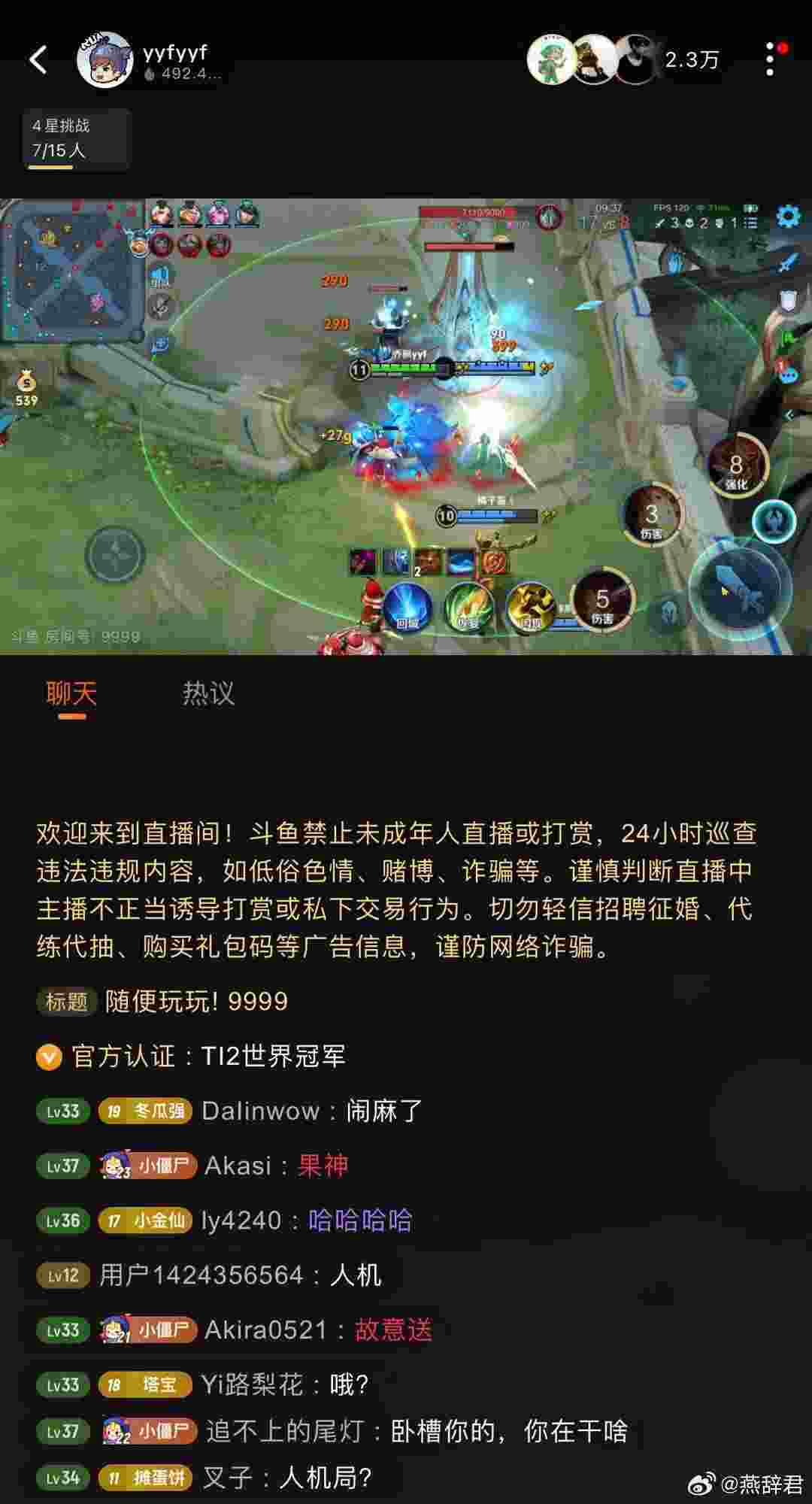 YYF:闹麻了,斗鱼的人跑来问我,你这王者是不是接了私活,接了商务,我说TMD没接商务,闹麻了,就是随便玩一下,水友说天天看4+2和吃鸡,看腻了,换个直播内容。